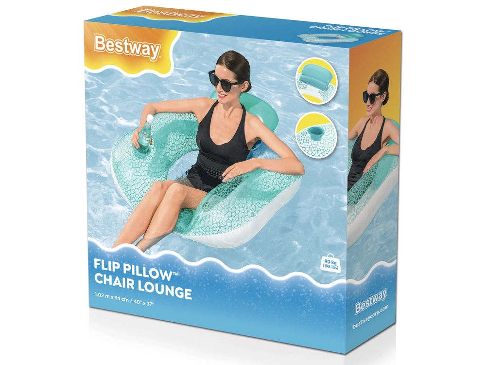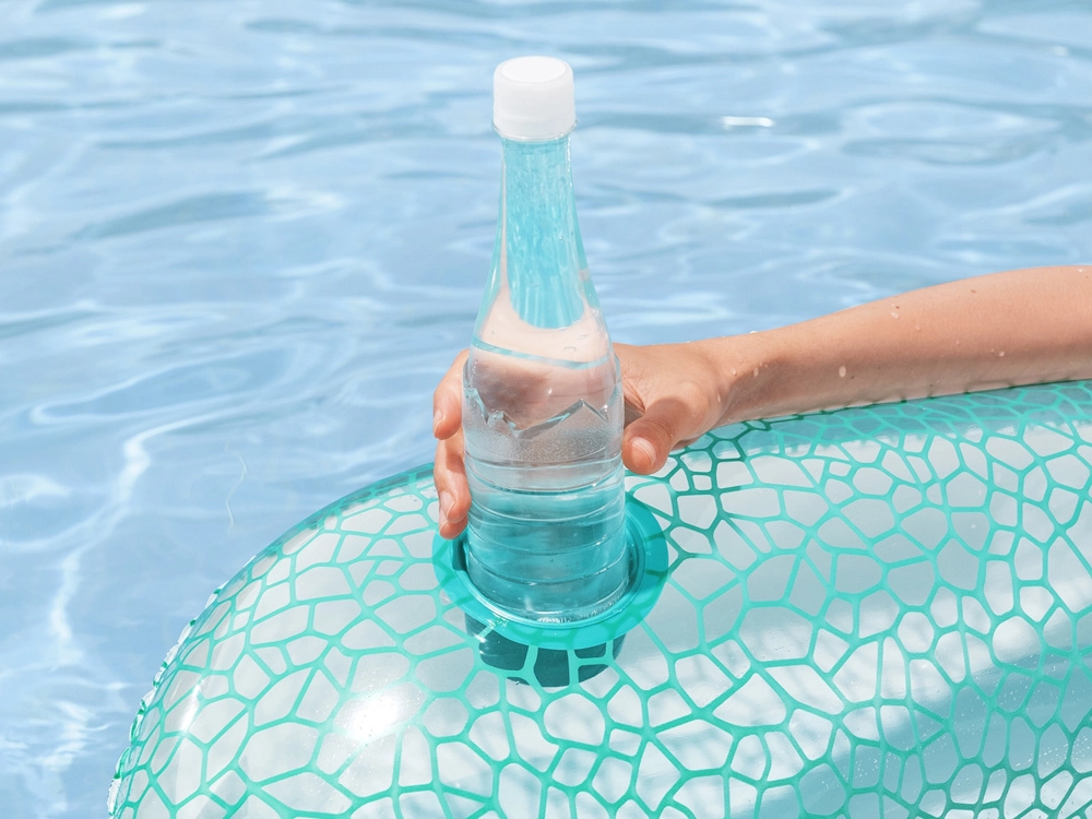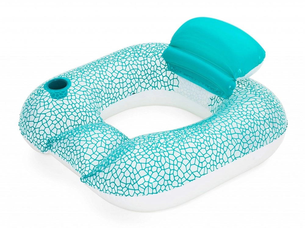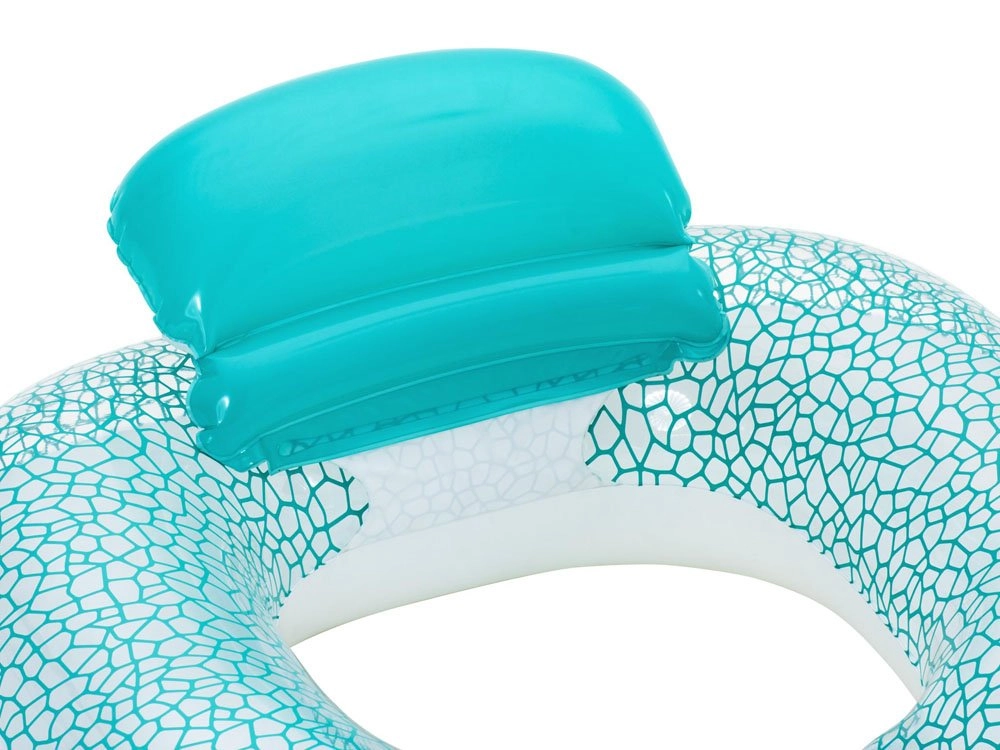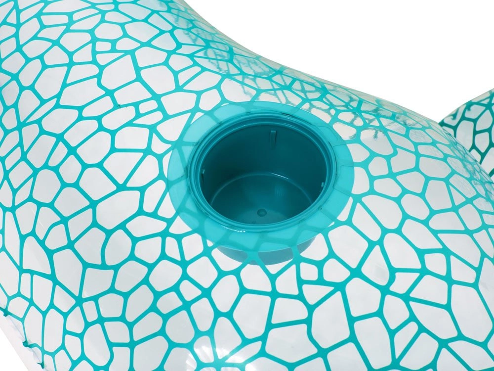 Το φουσκωτό ανάκλιντρο σε σχήμα πολυθρόνας συνδυάζει άνεση και πρακτικότητα για χαλάρωση κοντά στο νερό. Το εργονομικό στήριγμα πλάτης υποστηρίζει την πλάτη, ενώ ο υποδοχέας για ποτήρι ή μπουκάλι κρατά το αγαπημένο σας ρόφημα πάντα κοντά. Ο κομψός τιρκουάζ‑λευκός μωσαϊκός σχεδιασμός ξεχωρίζει σε κάθε υδάτινη επιφάνεια.