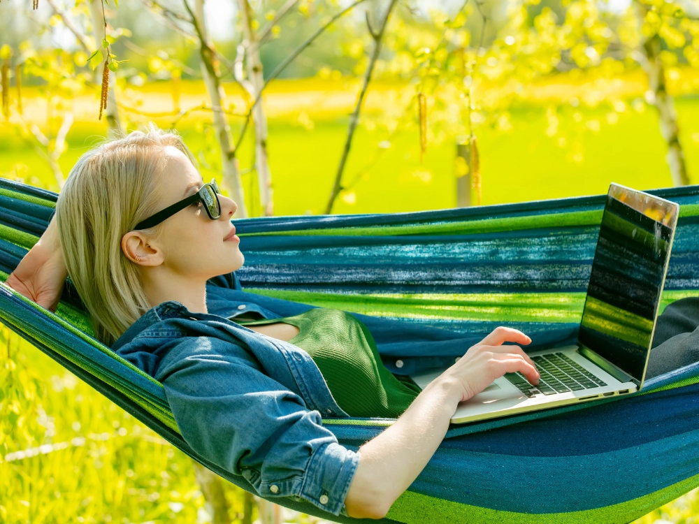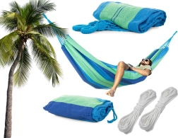 Η φαρδιά επιφάνεια ξαπλώματος προσφέρει μέγιστη άνεση για δύο άτομα, ενώ τα ανθεκτικά σχοινιά και το ποιοτικό ράψιμο εξασφαλίζουν σταθερότητα και ασφάλεια. Όταν διπλωθεί, καταλαμβάνει ελάχιστο χώρο και χάρη στη θήκη μπορείτε εύκολα να τη πάρετε σε πικνίκ, κάμπινγκ ή διακοπές.