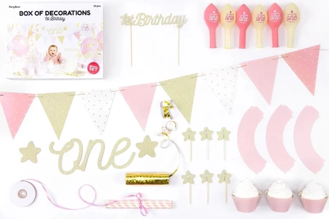 Στιλάτο σετ διακοσμήσεων γενεθλίων σε κομψό ροζ‑χρυσό συνδυασμό για τα πρώτα γενέθλια. Περιλαμβάνει ό,τι χρειάζεστε για γρήγορο και αρμονικό στολισμό – από banner «One» και χάρτινη γιρλάντα μέχρι μπαλόνια, topper για τούρτα, διακοσμητικά και θηκάκια για μάφιν, καλαμάκια, χρυσές σερπαντίνες και σατέν κορδέλα. Όλα είναι πρακτικά συσκευασμένα σε κουτί.