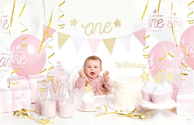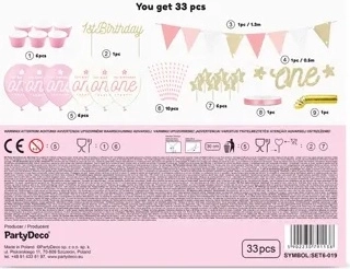 - Banner «One» (1 τεμ.), χάρτινη γιρλάντα (1 τεμ.), διακοσμητικά για μάφιν (6 τεμ.), θηκάκια για μάφιν ανοιχτό ροζ (6 τεμ.), topper για τούρτα (1 τεμ.), καλαμάκια (10 τεμ.), μπαλόνια μικτή ποικιλία σχεδίων (6 τεμ.), χρυσές σερπαντίνες (1 τεμ.), σατέν κορδέλα ανοιχτό ροζ 6 mm (1 τεμ.)