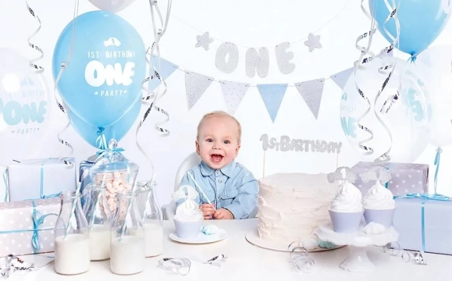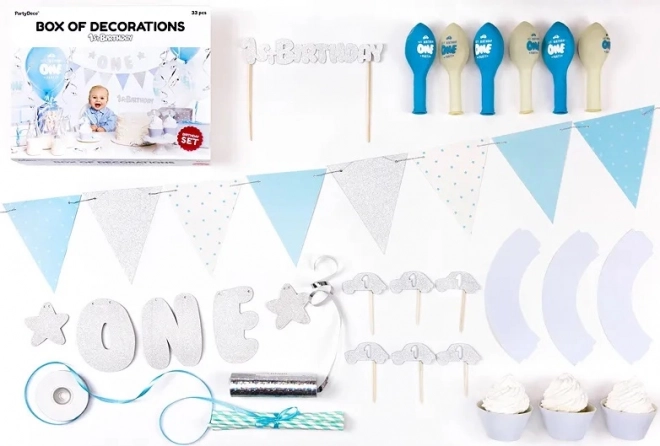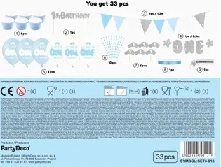 - Banner "One" (1 τμχ), χάρτινη γιρλάντα (1 τμχ), διακοσμητικά για μάφιν (6 τμχ), μπλε καλαθάκια για μάφιν (6 τμχ), topper για τούρτα (1 τμχ), καλαμάκια (10 τμχ), μπαλόνια – ποικιλία σχεδίων (6 τμχ), ασημί σερπαντίνες (1 τμχ), ανοιχτό μπλε σατέν κορδέλα (πλάτος 6 mm, 1 τμχ)