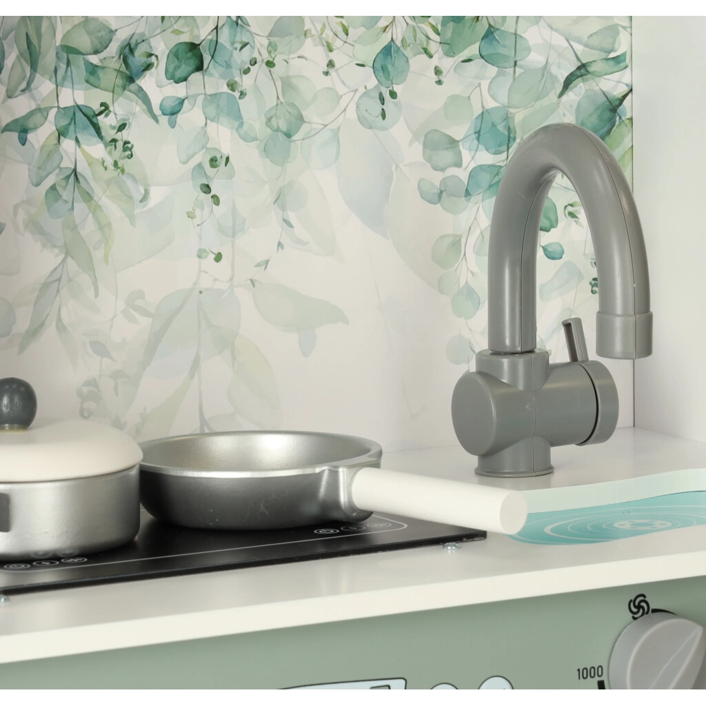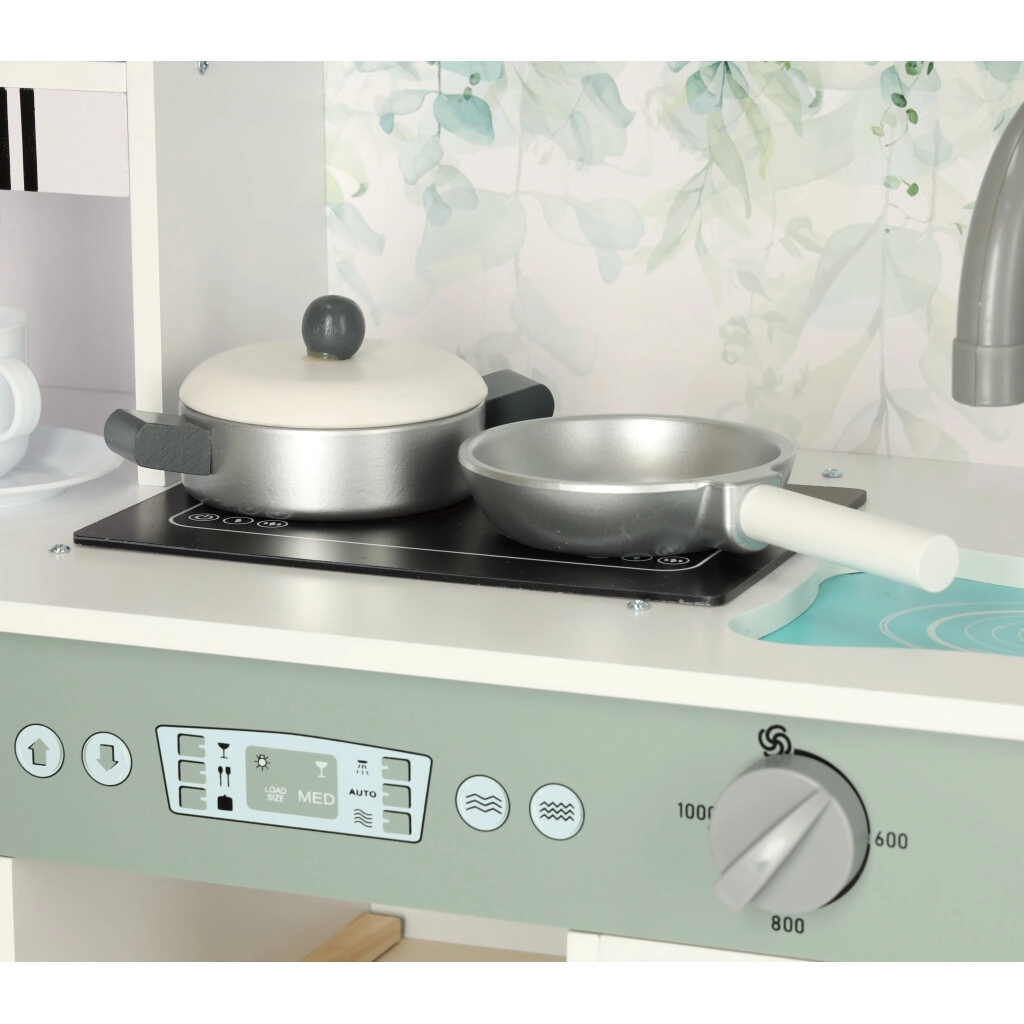 Η κουζίνα περιλαμβάνει φούρνο μικροκυμάτων, πλυντήριο, φούρνο και καφετιέρα, επιτρέποντας στα παιδιά να εξερευνούν και να μιμούνται πραγματικές κουζινικές εργασίες.