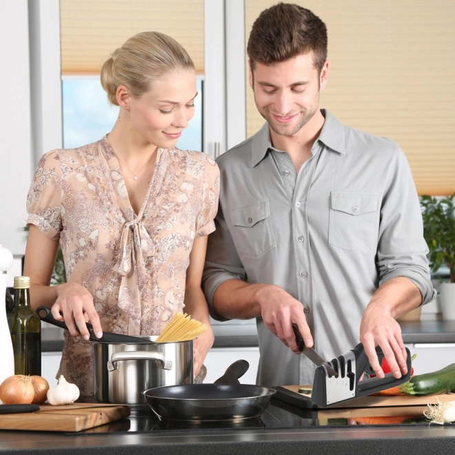 Ο καθολικός ακονιστής 4σε1 έχει σχεδιαστεί για ολοκληρωμένη φροντίδα των μαχαιριών και των ψαλιδιών κουζίνας. Τα τρία διαδοχικά στάδια από διαφορετικά υλικά αποκαθιστούν την κόψη από το χονδρικό ίσιωμα έως το λεπτό γυάλισμα, ώστε να πετυχαίνετε κοφτερότητα επαγγελματικής κουζίνας. Η τέταρτη θυρίδα προορίζεται για γρήγορο και ακριβές ακόνισμα ψαλιδιών.