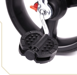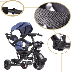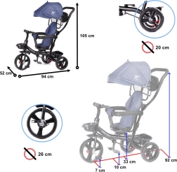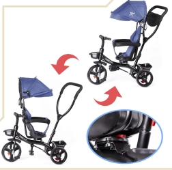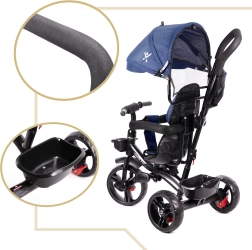 Για μέγιστο έλεγχο υπάρχει περιστρεφόμενο κάθισμα 360°, που επιτρέπει θέση προς τον γονέα ή προς τα εμπρός. Ο ελεύθερος τροχός επιτρέπει στον γονέα να αναλάβει την κίνηση με έναν διακόπτη. Οι τροχοί χωρίς σαμπρέλα προσφέρουν άνεση σαν των φουσκωτών χωρίς άγχος για πίεση ή τρύπημα. Περιλαμβάνονται τρίσταδη αναδιπλούμενη κουκούλα με σίτα, αφαιρούμενη ράβδος καθοδήγησης με αφρώδη επένδυση και πρακτικά βοηθητικά αποθήκευσης.