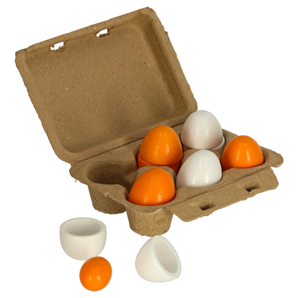 Διασκεδαστικό και εκπαιδευτικό σετ ξύλινων αυγών σε χάρτινο κουτί βοηθά τα παιδιά να αναπτύξουν τη λεπτή κινητικότητα, τη λογική σκέψη και το παιχνίδι ρόλων ως μικροί σεφ. Η ρεαλιστική θήκη για 6 αυγά (3 ολόκληρα και 3 με αποσπώμενους κρόκους) είναι ασφαλής, ανθεκτική και ιδανική για παιδική κουζίνα, μανάβικο ή εστιατόριο.