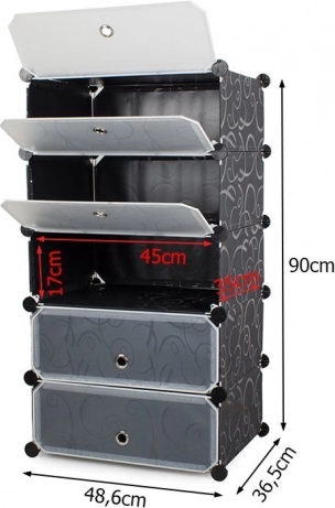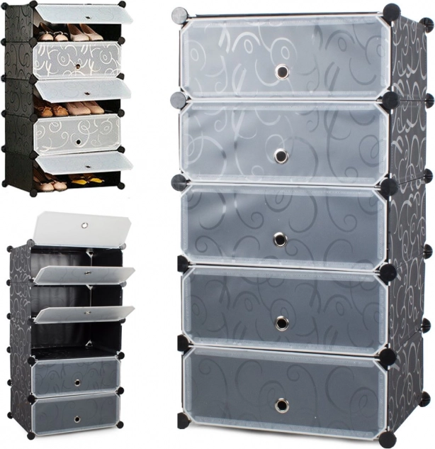 Το ντουλάπι παπουτσιών διαθέτει 5 ράφια, τα οποία μπορούν να στοιβαχτούν ευέλικτα ή να τοποθετηθούν δίπλα-δίπλα ανάλογα με τον χώρο και τις ανάγκες. Η κατασκευή είναι ελαφριά και σταθερή, διευκολύνοντας τον χειρισμό και τη συναρμολόγηση. Χάρη στα διαφανή παραθυράκια, βρίσκετε εύκολα και γρήγορα αυτό που ψάχνετε. Το υλικό του ντουλαπιού είναι αδιάβροχο και καθαρίζεται χωρίς δυσκολία.