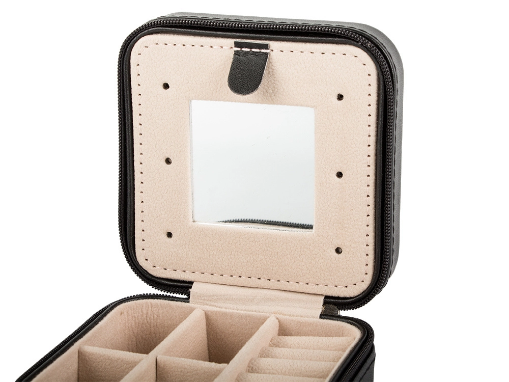 Κομψή ταξιδιωτική θήκη κοσμημάτων με συμπαγείς διαστάσεις που προστατεύει και οργανώνει άψογα τα κοσμήματά σας στο σπίτι και στο ταξίδι. Προσφέρει πολλαπλές θήκες, μαλακό χώρο για δαχτυλίδια, γαντζάκια για αλυσίδες και πρακτικό καθρέφτη. Χάρη στο κλείσιμο με φερμουάρ τα αξεσουάρ σας μένουν ασφαλή και το απαλό βελούδινο εσωτερικό αποτρέπει τις γρατζουνιές.