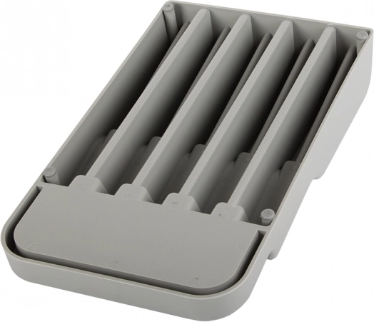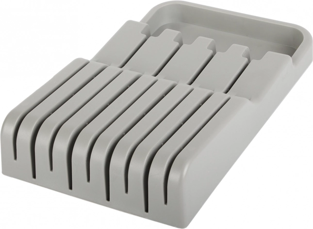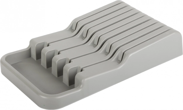 Ο οργανωτής μαχαιριών για συρτάρι είναι εξαιρετική επιλογή για κάθε μοντέρνα ή παραδοσιακή κουζίνα. Είναι κατασκευασμένος από ανθεκτικό πλαστικό σε κομψό γκρι χρώμα, που εξασφαλίζει μεγάλη αντοχή. Χάρη στις συμπαγείς διαστάσεις του χωρά εύκολα σε κάθε τυπικό συρτάρι κουζίνας, ενώ βελτιστοποιεί τον χώρο.