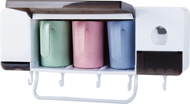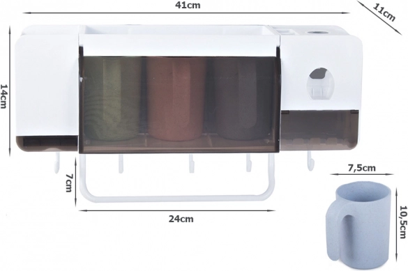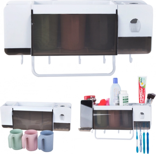 Έξυπνος οργανωτής μπάνιου που συνδυάζει αποθήκευση για βούρτσες, πάστα και καλλυντικά σε ένα συμπαγές σύνολο. Ο αυτόματος διανομέας οδοντόκρεμας απλοποιεί την καθημερινή υγιεινή, ενώ οι θήκες για αξεσουάρ χωρούν κρέμες, πινέλα μακιγιάζ ή αποσμητικά. Τρία ανθεκτικά πλαστικά ποτήρια (300 ml) είναι ιδανικά για όλη την οικογένεια.