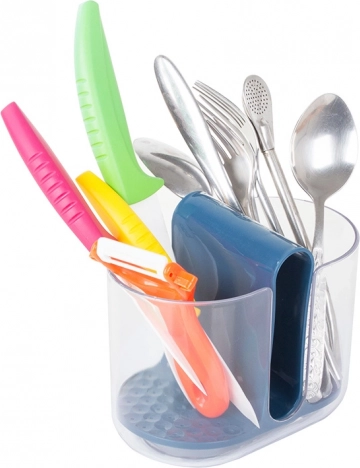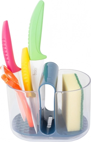 Οι πλευρικές θήκες προορίζονται για μαχαιροπίρουνα, ενώ η μεσαία θήκη είναι ιδανική για σφουγγάρι/βούρτσα πιάτων. Τα ενσωματωμένα ανοίγματα επιτρέπουν στο νερό από τα μαχαιροπίρουννα να πέφτει στον πάτο, εξασφαλίζοντας γρήγορο στέγνωμα. Το στραγγιστήρι αφαιρείται εύκολα, διευκολύνοντας το άδειασμα και τη συντήρηση.