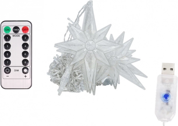 Η κουρτίνα διαθέτει 6 μεγάλα αστέρια και 6 μικρότερα αστέρια, με συνολικό μήκος 5 μ.. Μπορείτε να επιλέξετε από 8 διαφορετικά προγράμματα φωτισμού για να δημιουργήσετε την επιθυμητή ατμόσφαιρα μέσω του παρεχόμενου τηλεχειριστηρίου.